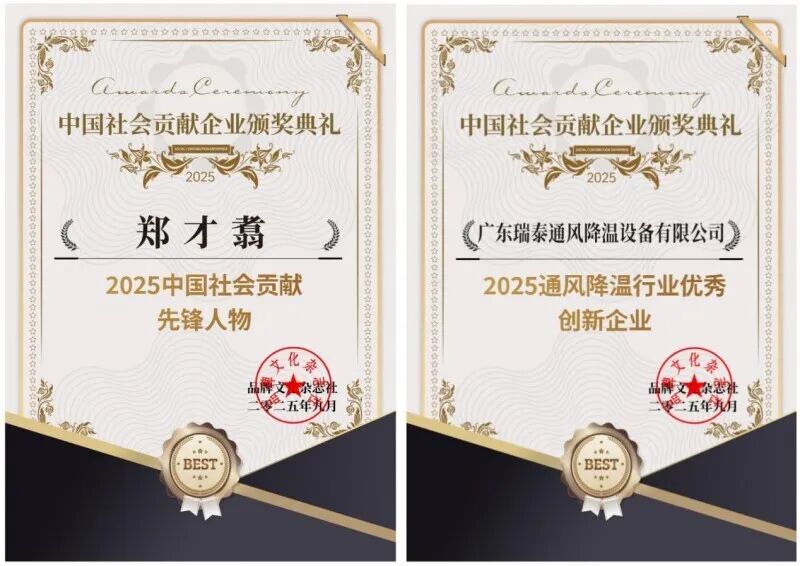 在本次颁奖典礼上,广东瑞泰公司凭借在通风降温领域的持续创新与卓越成就,荣获“2025通风降温行业优秀创新企业”大奖。同时,公司董事长郑才翥先生因其扎根行业二十余年的深厚积淀与突出社会贡献,荣膺“2025中国社会贡献先锋人物”重要奖项,实现企业与个人的双项荣誉加冕。