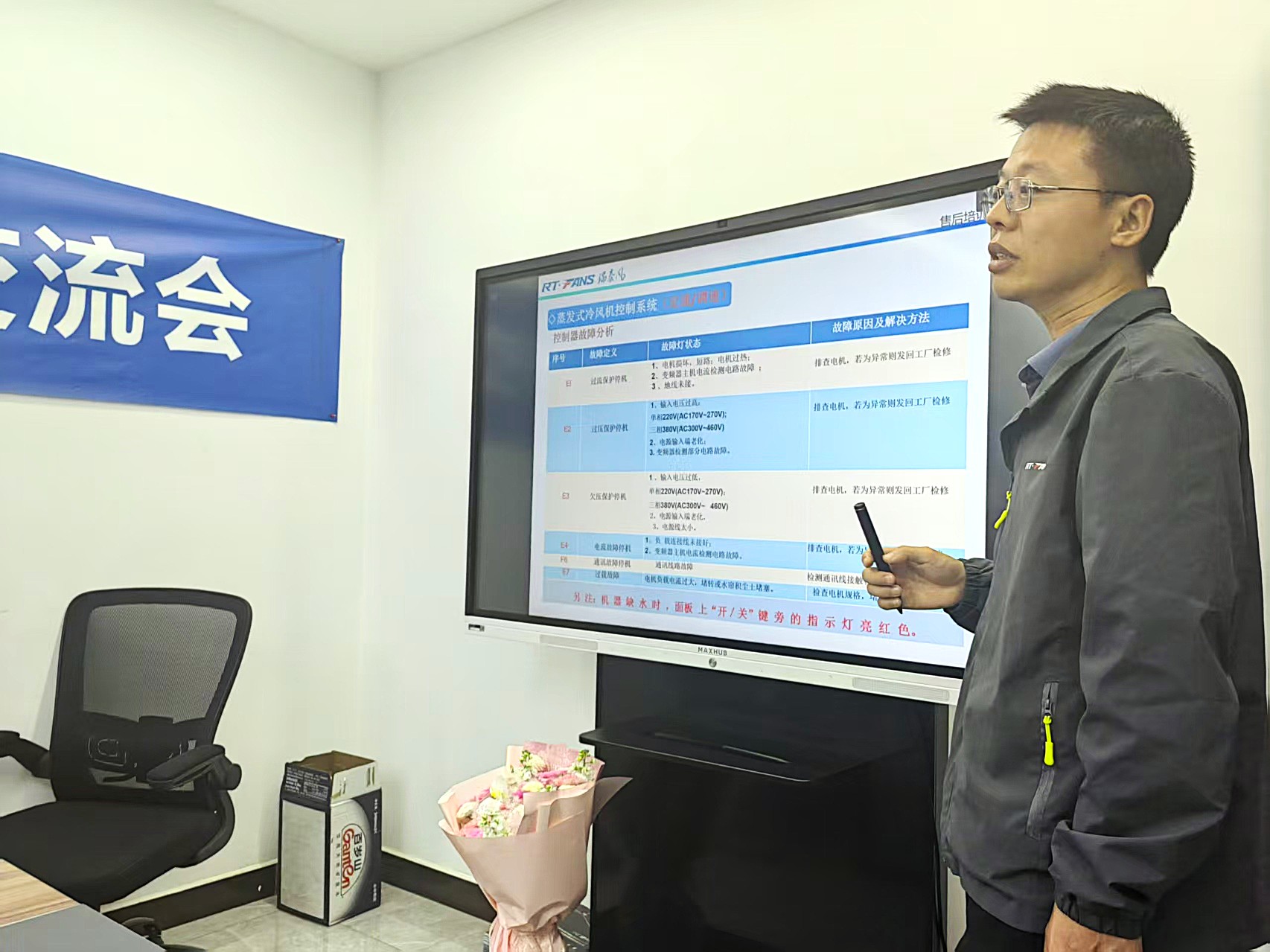 瑞泰风技术部王工聚焦售后服务与技术保障,围绕产品常见故障分析、售后重难点问题处置,通过 PPT 理论讲解与现场实操演示相结合,手把手指导维修流程与操作规范,全面提升伙伴专业服务水平,筑牢客户服务保障体系。